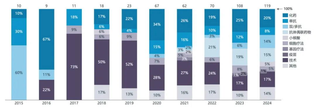 2015-2024年中国创新药 License-out 交易项目类型