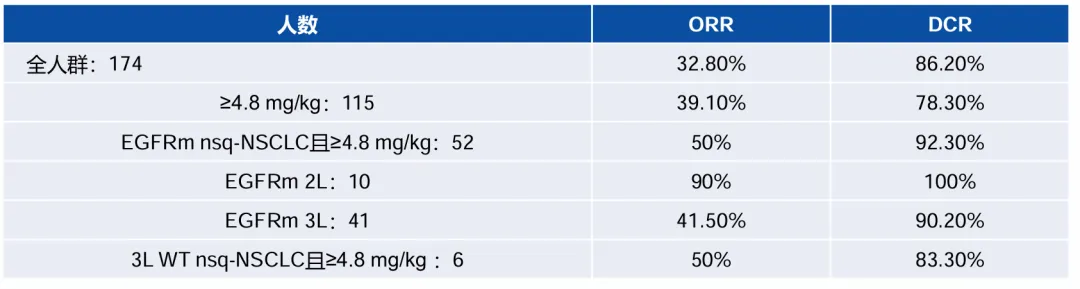 在52名接受≥4.8 mg/kg治疗的EGFR突变型非鳞状NSCLC患者中,ORR为50%、DCR为92.3%;