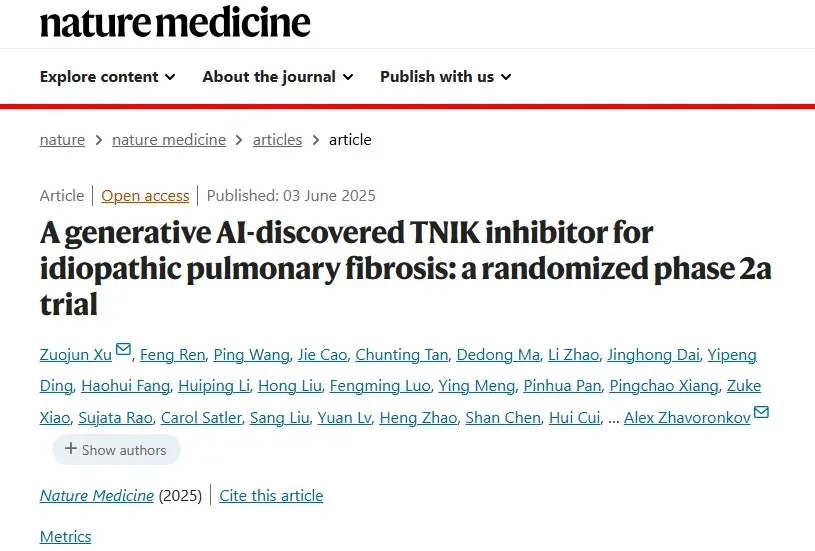 2025年6月3日,首个人工智能(AI)驱动药物研发的临床概念验证成果在顶尖期刊《Nature Medicine》上发表。英矽智能发布了业界首个完成临床药效概念验证的AI药物——TNIK抑制剂Rentosertib(ISM001-055)在IIa期临床试验的安全性和有效性数据。