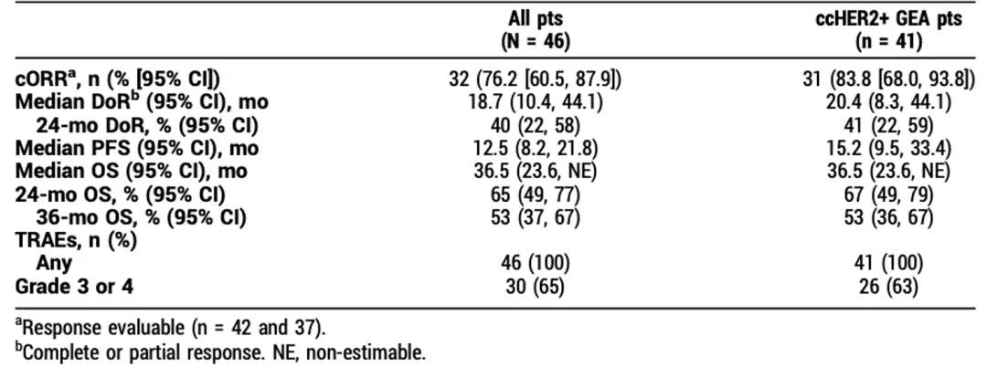 在确认为HER2阳性mGEA患者中,总客观缓解率(cORR)、中位反应持续时间(mDoR)和中位无进展生存期(mPFS)分别为83.8%,20.4个月和15.2个月。中位OS为36.5个月,最长生存时间为57.9个月(数据截止时无死亡)。