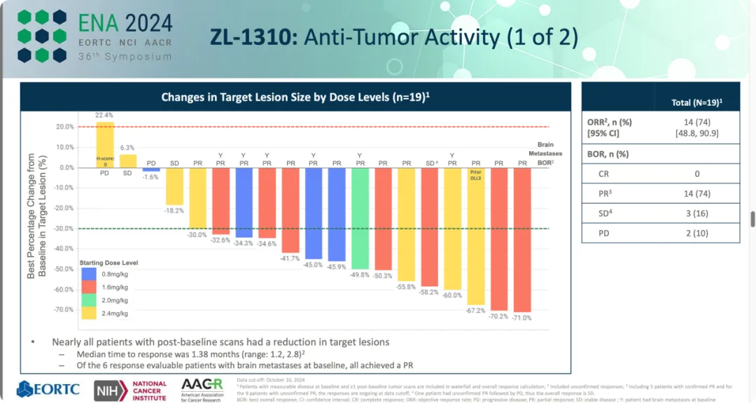 再鼎医药的ADC首秀就在去年十月惊艳了众人。它的首发ADC管线——ZL-1310在小细胞肺癌适应症表现出了非凡的疗效。当时公布的数据的瀑布图如下图所示,总的19人可以评估疗效,ORR达到了74%,14人全部为PR,而仅有10%的人出现了病情的进展。