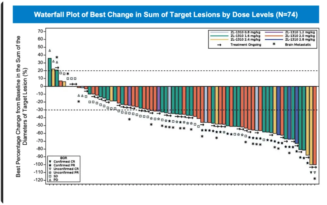 然后就是大家最关注的疗效数据了,总体患者的瀑布图如图所示,可以评估疗效的患者达到了74名。
