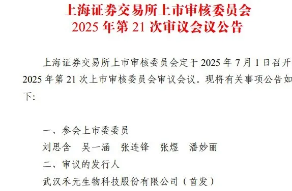 6月24日,上海证券交易所上市审核委员会发布2025年第21次审议会议公告,宣布定于2025年7月1日审议武汉禾元生物科技股份有限公司(以下简称:禾元生物)首发上市。