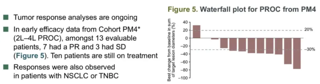 值得注意的是,在铂耐药卵巢癌这样预后差和治疗手段有限的“冷肿瘤”亚组中,PM8002单药治疗早期临床数据取得ORR为20.6%、mPFS为8.3个月;在最新披露的DB-1305+PM8002联用数据显示:在13名2-4线铂耐药卵巢癌患者中,联合疗法取得了54%的ORR(其中7名部分缓解,3名疾病稳定),DCR为77%,可以看到联合疗法相比PM8002单药疗效有显著提升。
