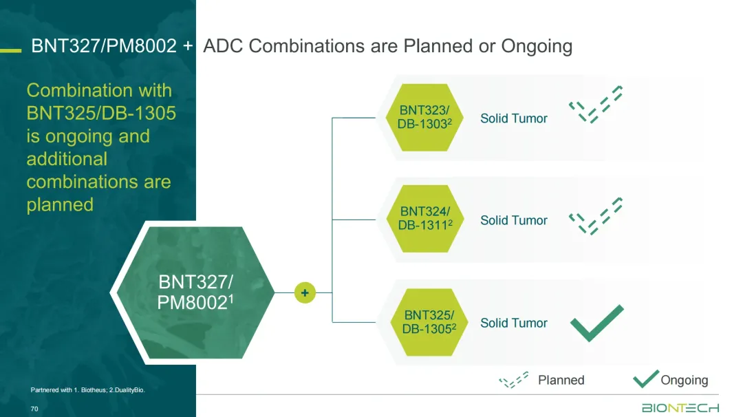 获得BMS认可的BioNTech,正在全面推进自家PD-L1/VEGF双抗与各个引进的ADC管线联用,覆盖各大实体瘤适应症。