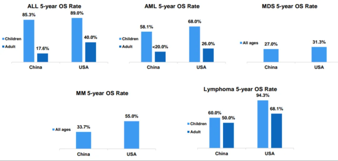 中国更是如此。如下图所示,我国血液肿瘤患者5年生存率,相较于美国等发达国家和地区而言,仍有较大差距[1]。