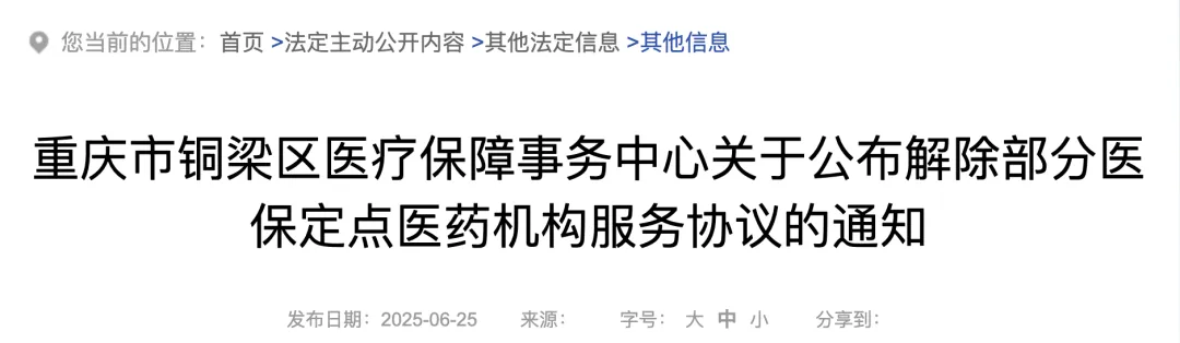 6月25日,重庆市铜梁区医疗保障事务中心发布《公布解除部分医保定点医药机构服务协议的通知》,130家定点医药机构因不符合准入条件将不再续签医保定点服务协议,其中62家为定点医疗机构。