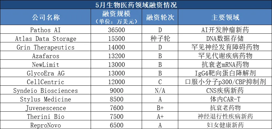 前沿技术路线与新靶点受到关注:5月,AI肿瘤药物公司Pathos AI、DNA数据存储公司Atlas Data Storage、罕见代谢病药企Azafaros、表观遗传学药企CellCentric、体内Car-T药物公司Stylus Medicine等前沿技术公司均获得大额融资。