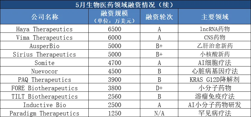 核酸药物仍是热点。5月,多家不同技术路径的mRNA药企获得大额融资,如融资1.3亿美元的抗衰老药企NewLimit、融资6500万美元的lncRNA药企Haya Therapeutics、融资5000万的Sirius Therapeutics等;