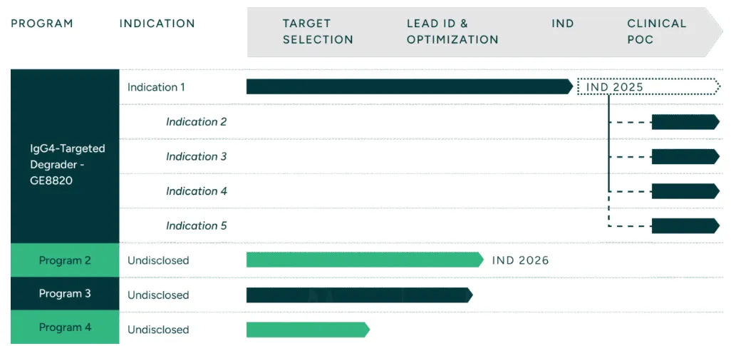 GlycoEra领先项目GE8820旨在以当前药物形式和不需要免疫抑制无法达到的速度、深度和高选择性降解致病性IgG4自身抗体,计划今年进入临床试验。在临床前,GE8820已在各种模型中证明了IgG4的深度和持续耗竭,使其在多种疾病环境中具有广泛的潜力。