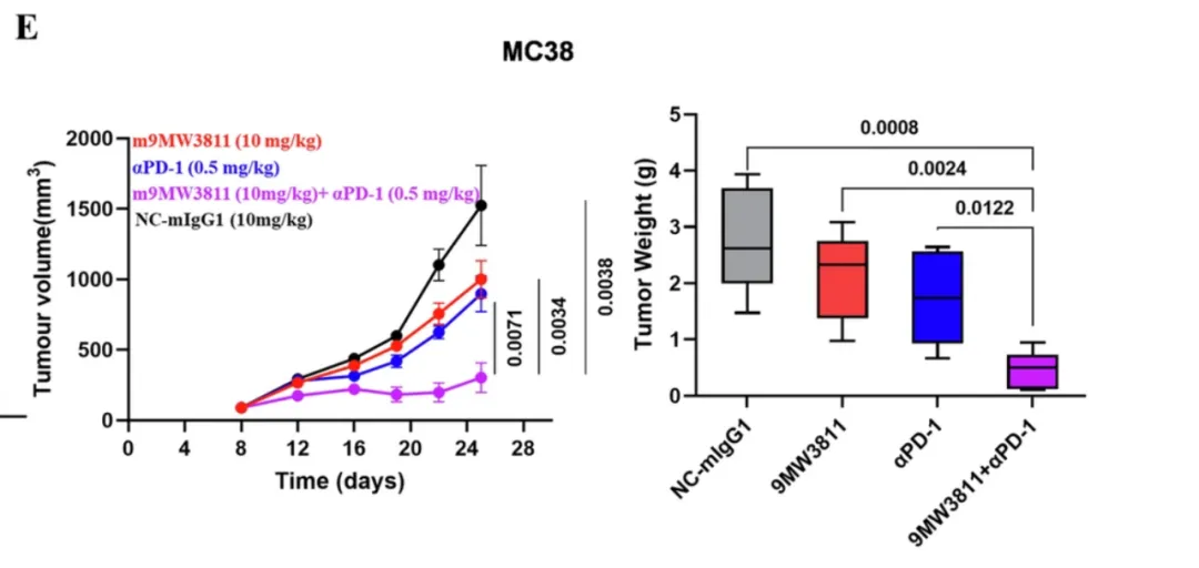 这是该靶点适应症主要应用的情况,再说回9MW3811,采用LALA修饰技术,能够消除其与多种Fc受体(FcγRs)的结合,既可以降低与细胞表面Fc受体结合后Fc介导的可能毒性风险,还可以延长半衰期。除了上述的纤维化适应症来看,9MW3811还在今年五月发表了一篇论文:《IL-11/IL-11R signal inhibition by 9MW3811 remodels immune tumor microenvironment and enhances anti-tumor efficacy of PD-1 blockade》,表明9MW3811可以抑制肿瘤生长,且与PD-1单抗具有协同作用。