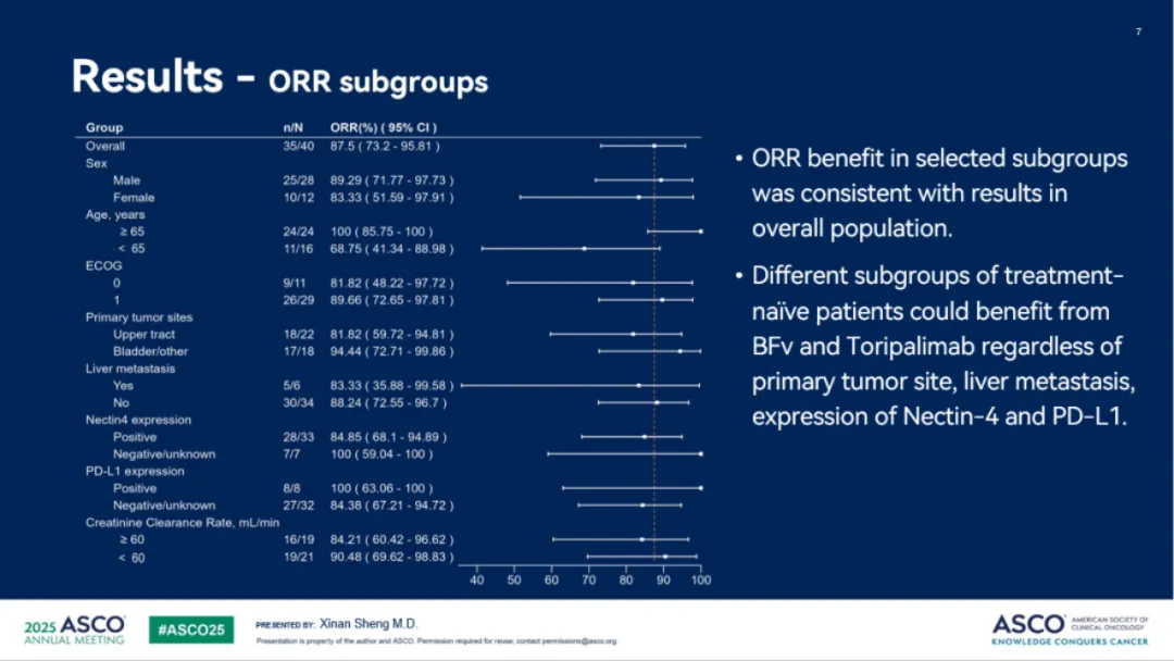 最后疗效上,ORR达到了非常惊人的87.5%,cORR达到了80%,CR率为12.5%。DCR为92.5%。最佳靶病灶大小变化与基线相比,97.5%的受试者肿瘤病灶缩小,57.5%的受试者肿瘤缩小超过50%,疗效可以说是非常惊人了。最后亚组分析上,年龄超过65岁、肿瘤原发部位为下尿路、肝转移、Nectin-4 表达阴性以及 PD-L1 表达阳性的受试者 ORR 分别为100%(24/24)、94.44%(17/18)、83.33%(5/6)、100%(7/7)、100%(8/8)。