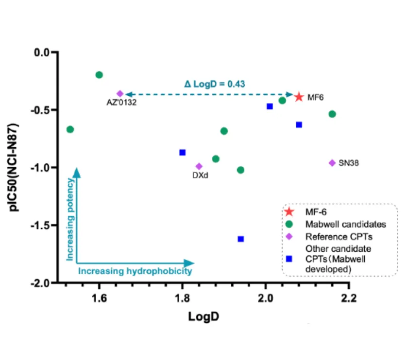 而payload就是Mtoxin了,它的水溶性-效力关系如图所示,横坐标往右表示越疏水——而payload往疏水方向发展,linker往亲水方向发展是大致趋势。如图所示来看,Mteoxin是真正做到了疏水和杀伤性结合的极致。