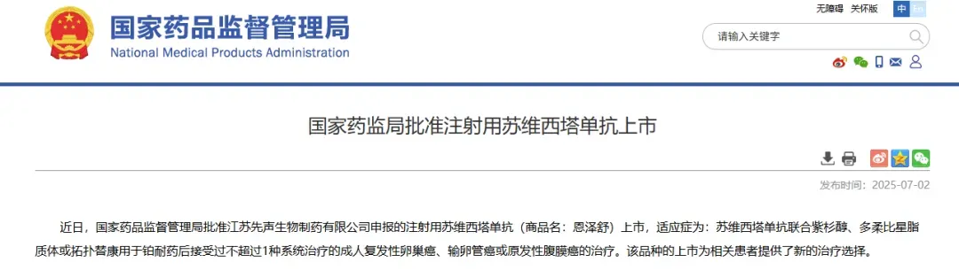 2025年7月3日,先声药业集团(2096.HK)旗下创新药子公司先声再明宣布,其在中国开发的新一代抗肿瘤血管生成(抗VEGF抗体)一类生物新药恩泽舒®(注射用苏维西塔单抗)已正式获中国国家药品监督管理局批准上市(批准文号国药准字S20250037,批准日期2025年6月30日)。恩泽舒®获批适应症为联合紫杉醇、多柔比星脂质体或拓扑替康用于铂耐药后接受过不超过1种系统治疗的成人复发性卵巢癌、输卵管癌或原发性腹膜癌的治疗。