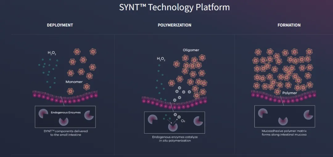 Syntis Bio的SYNT™(SYNthetic Tissue-lining)平台代表了生物制剂口服递送的一种全新方法。该技术由Robert Langer及公司另一位联合创始人Giovanni Traverso开发,向富含过氧化氢酶的组织(如十二指肠)递送一种安全、短暂的聚多巴胺涂层。聚多巴胺“衬里”可在胃肠道中维持24小时,之后自然安全地从体内清除。