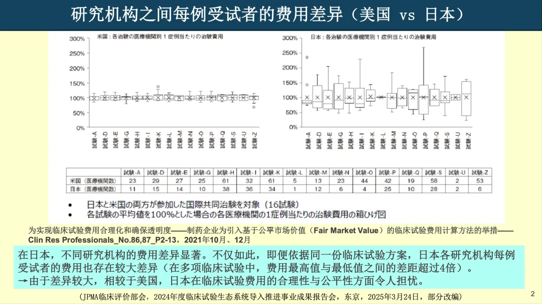 •日本现行临床试验费用计算方法存在诸多问题,研究机构之间每例受试者的费用差异较大,总体费用普遍高于其他国家和地区,在合理性、公平性与透明度方面难以获得国际理解。