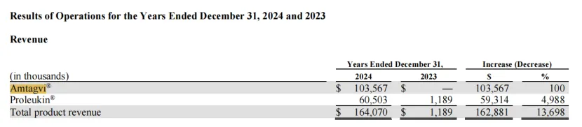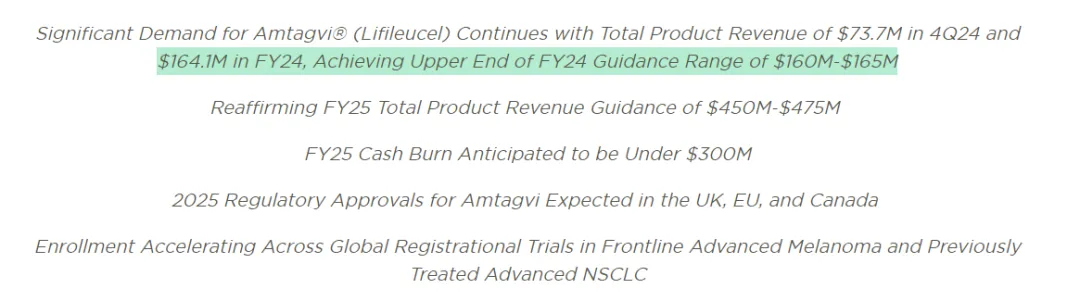 Amtagvi(lifileucel)于2024年2月20日首次上市,定价51.5万美元。2024年第二季度是该产品在美国上市的第一季度,该季度总收入为1280万美元,截止2024年末,该产品的总收入为1.036亿美元,其中2024年第四季度收入4870万美元。