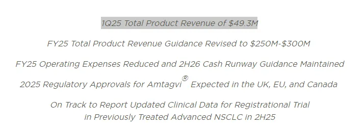但是2025年5月8日,Iovance的Q1财报显示,首款TIL疗法Amtagvi一季度销售额4360万美元,与去年四季度的4870万美元环比下降10%,同时公司对于2025年的收入指引从此前的4.50-4.75亿美元大幅度下调至2.50-3.00亿美元。受此消息影响,Iovance