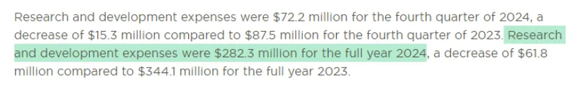 Iovance2024年度的研发费用投入2.82亿美元,同比2023年度3.44亿美元的研发投入,下降了17.9%,研发费用的下降主要归因于Amtagvi向商业化生产的过渡。