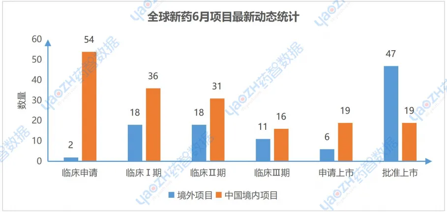 6月共678个药物有相关更新动态,其中有277个项目推进到最新的阶段,其中在中国境内进行的项目共175个,境外项目有102个。