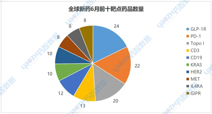 6月有更新动态的678个项目中,涉及最多的靶点是GLP-1R,其次是PD-1和Topo I。以下是排名前十的靶点,图中仅展示药品数量,具体内容可通过全球药物分析系统进行查看。
