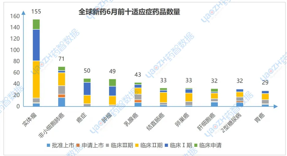 6月有更新动态的678个项目中,涉及最多的适应症是实体瘤,其次是非小细胞肺癌和癌症。以下是排名前十的适应症及其全球最高研发阶段情况,图中仅展示药品数量,具体内容可通过全球药物分析系统进行查看。