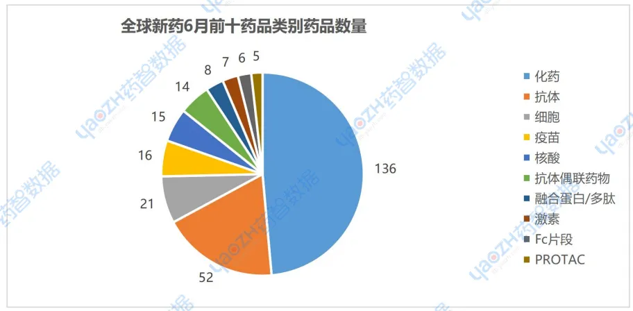 6月有最新进展的277个药品中,药品类别占比前三的分别化药49%,抗体19%,细胞7%。图中仅展示前十药品数量,具体内容通过全球药物分析系统进行查看。