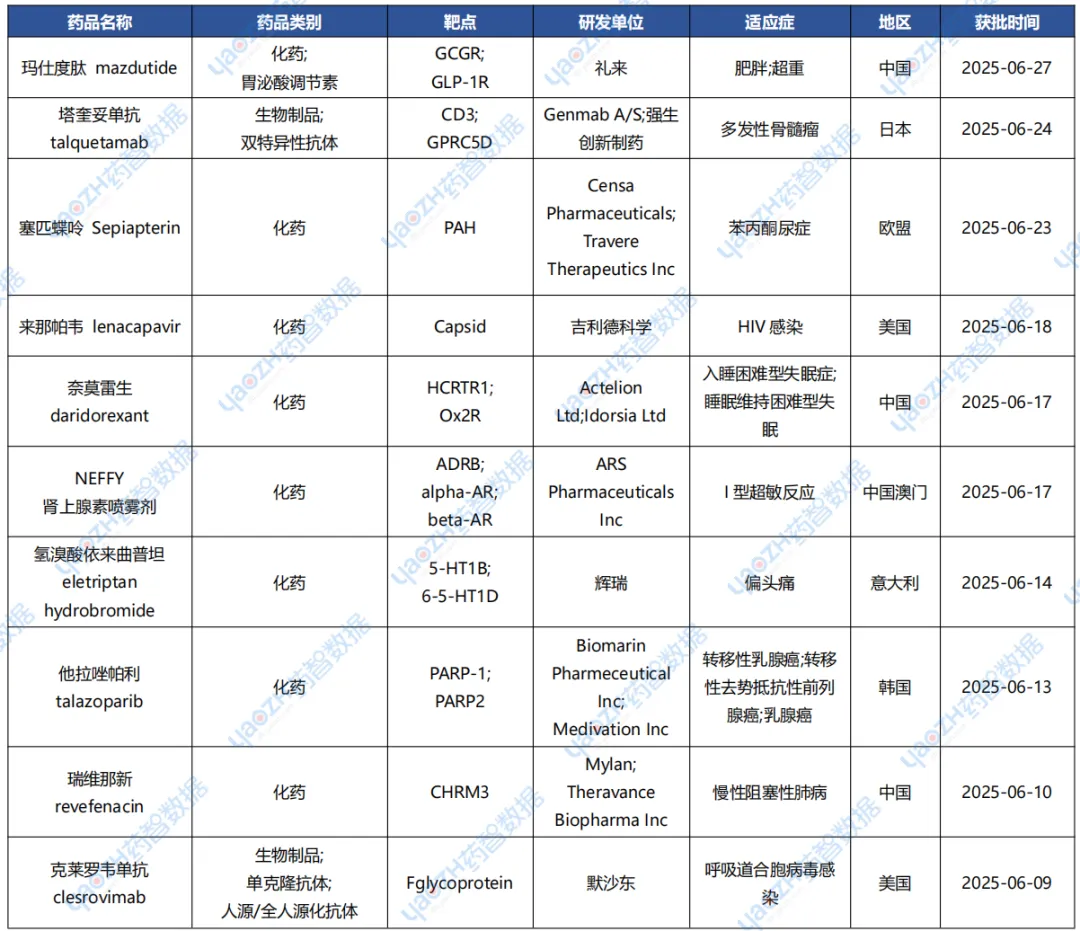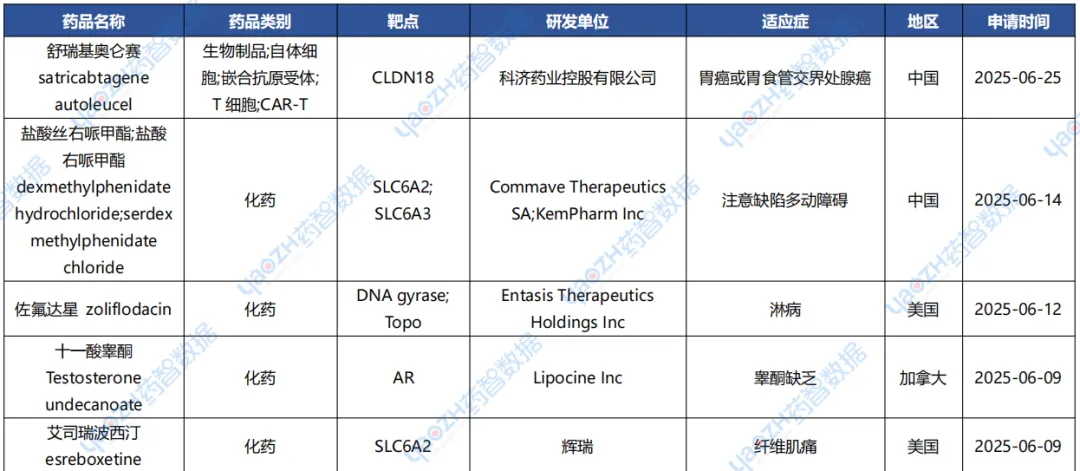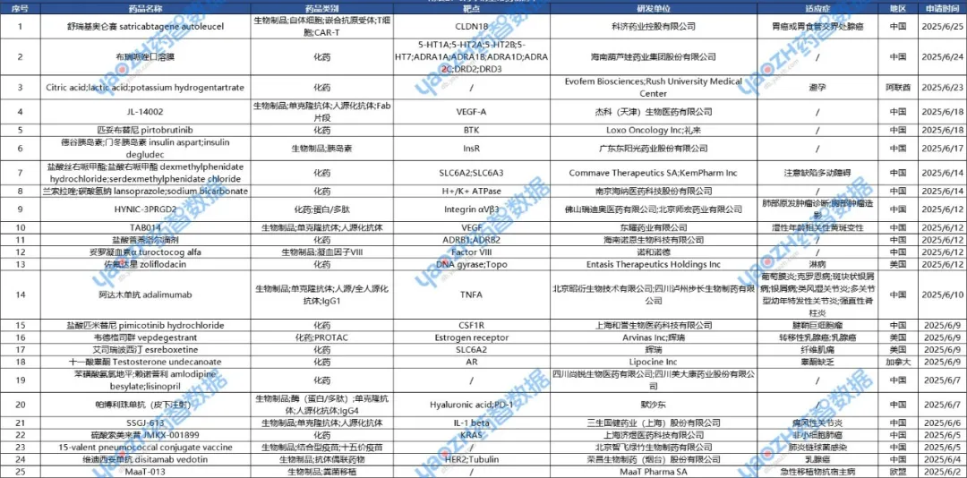 据全球药物分析系统显示,6月全球共25款药物申请上市(包括首次申请和新申请),下表展示部分重点申请上市药物,文末附完整清单,更多药品信息可通过全球药物分析系统进行查看。