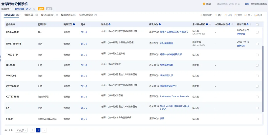 BCL6 靶向药物在研格局(图片来源:药智数据企业版-全球药物分析系统)