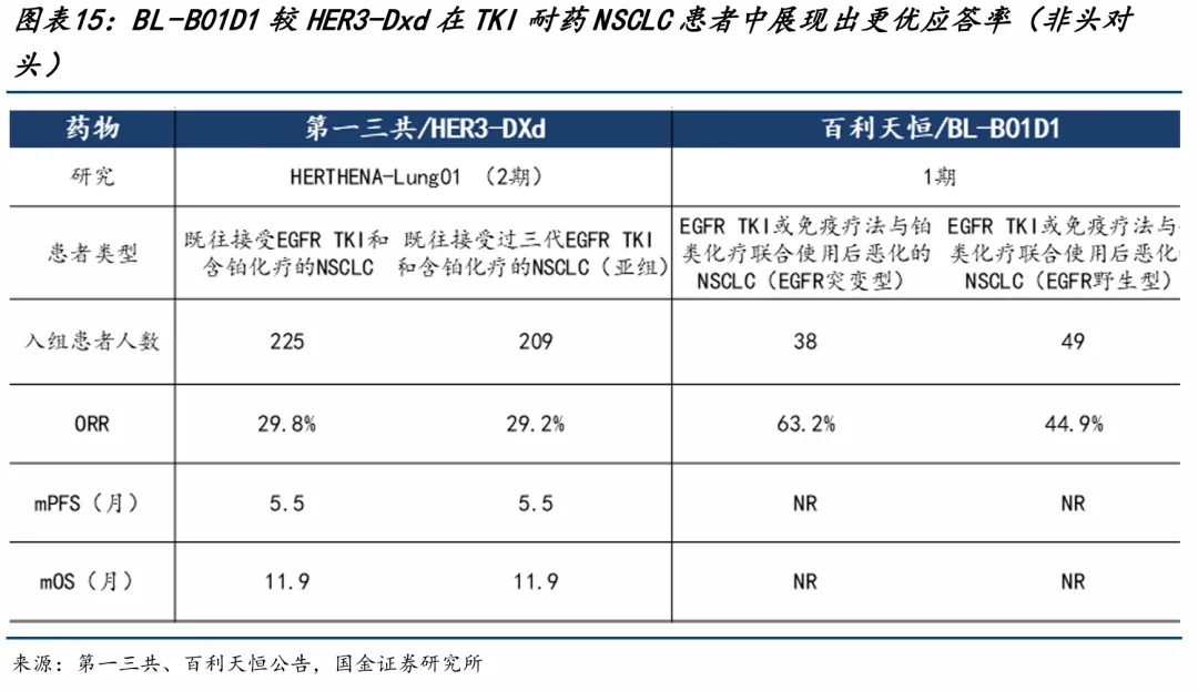 据公司在2023 ASCO的口头报告,BL-B01D1在EGFR突变型NSCLC患者中的ORR达63.2%,DCR达89.5%。横向对比来看,HER3-Dxd在同类TKI耐药NSCLC患者的二期临床中,ORR在29%左右,不过其患者样本量相比BL-B01D1一期临床更大。不过,BL-B01D1在小样本量临床中确实展现了双抗ADC相比单抗ADC客观缓解率翻倍的趋势,这是积极的。