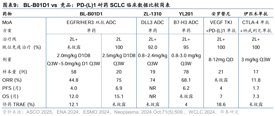 在PD-(L)1耐药小细胞肺癌(SCLC)领域,在20名患者中BL-B01D1单药2.5mg/kg剂量治疗取得了75.0%的cORR,PFS、OS分别达6.9个月和15.1个月;以该数据横向对比如DLL3
