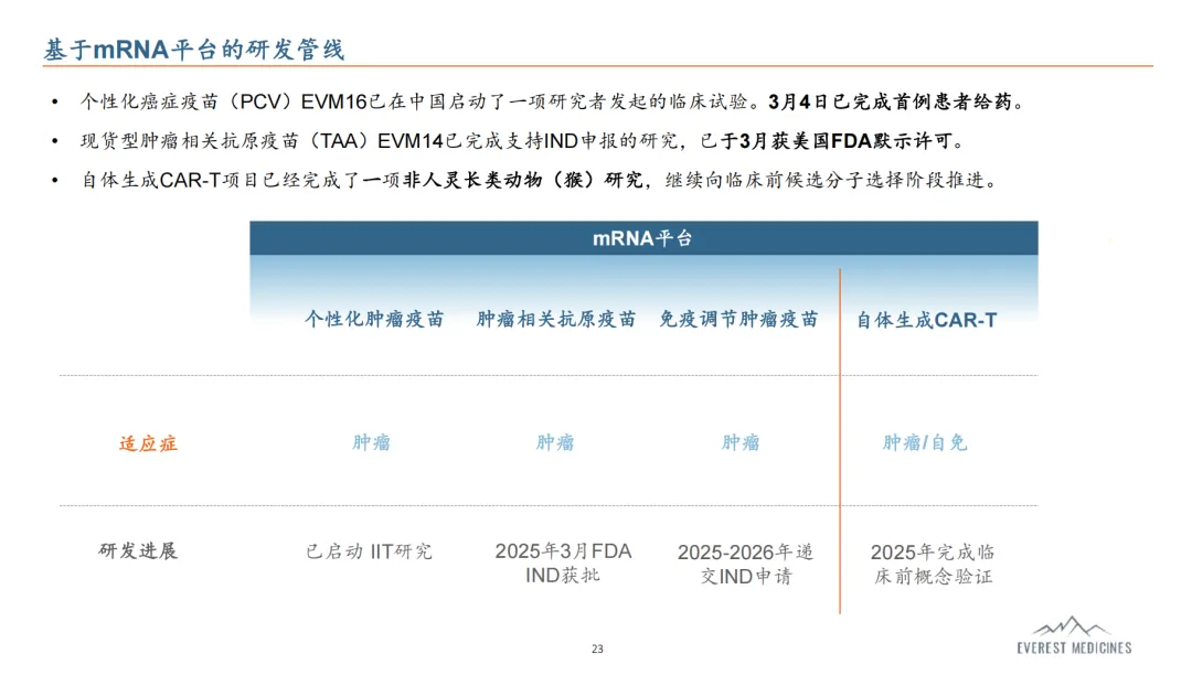 EVM16,临床前研究显示出良好安全性和强免疫原性,另外也与PD-1抗体联用后具有协同抗肿瘤效果。今年3月,该产品在国内完成了首例患者给药。当前临床试验初步数据显示,EVM16即使在低起始剂量下也能在晚期患者中引发良好的免疫原性,激发特异性T细胞免疫反应,充分验证了公司自主开发EVER-NEO-1 AI算法的可靠性。