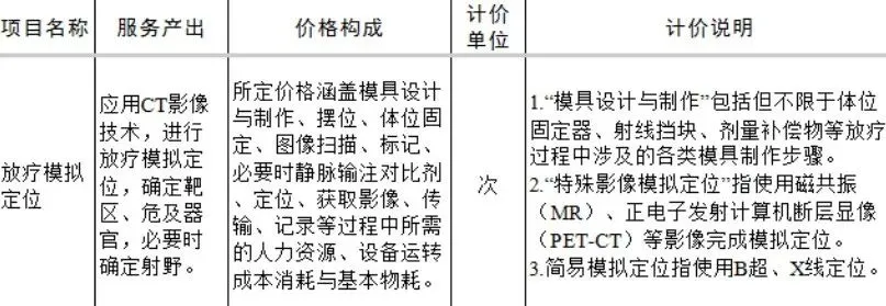 (一)以立项指南价格构成、服务产出和计价说明为依据。放射治疗类立项指南(简称“放疗类指南”)中,“放疗模拟定位”的价格构成,涵盖模具设计与制作、体位固定等所需的人力资源、设备运转成本消耗与基本物耗,同时计价说明里,进一步说明价格构成的“模具设计与制作”包括了体位固定器和剂量补偿物(见下表)。
