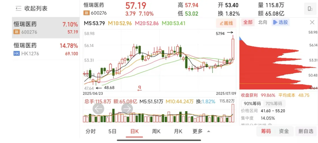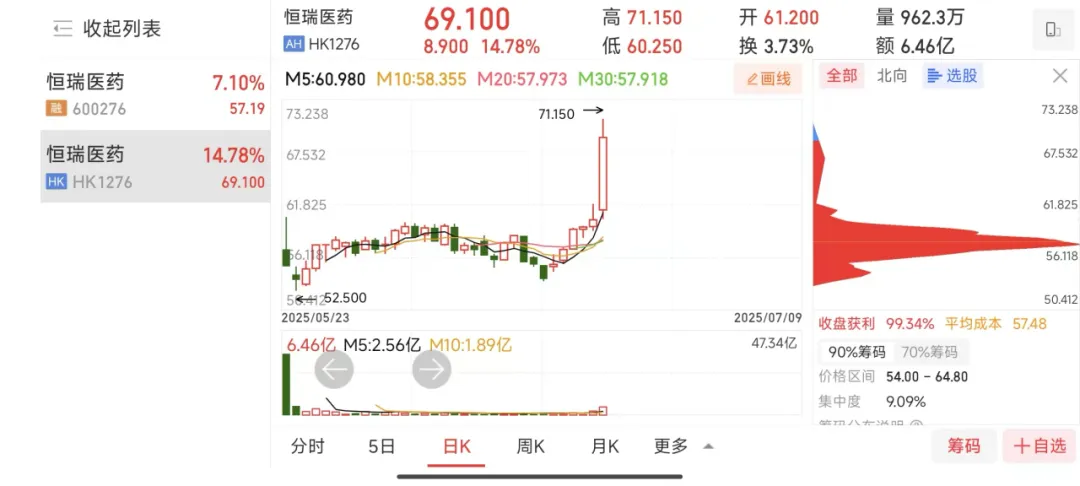 众所周知,恒瑞在A股上市了20多年了,它的流通股达到了63.79亿,筹码结构也较为分散。而在港股上市才如此短的时间,筹码分布较为集中,从下图的筹码分布图就可以看出,A股的筹码峰明显比H股要分散很多,H股则集中在56-58港元左右,这边是大多数A+H新股发行早期的筹码结构优化。