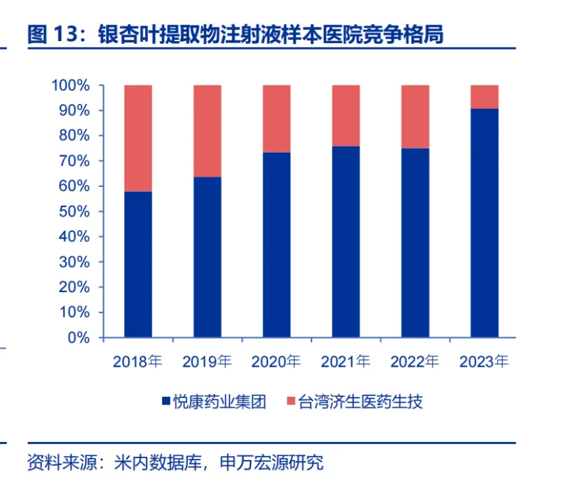 但是从该药的医院竞争格局来看,悦康集团的银杏叶提取物注射液市占率一直处于节节攀升的状态,到了2023年,其市占率甚至超过了90%,在这样的情况下,恐怕是2023年已经触顶,导致2024年销量的滑落。