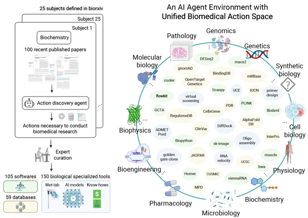 Biomni-E1:统一的生物医学软件和数据环境,整合了150个专业生物医学工具、105个软件包和59个数据库。