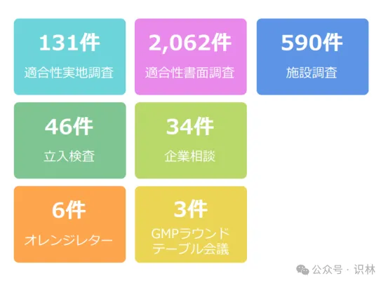 2024年,PMDA全年共实施了131件GMP/GCTP实地检查(“調査”),2,062件书面检查,以及590件设施检查和46件突击检查(“立入検査”)。此外,PMDA还处理了34件企业咨询,并发出了6封橙色警告信,组织了3次GMP圆桌会议,以促进行业内的交流和问题解决。