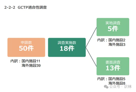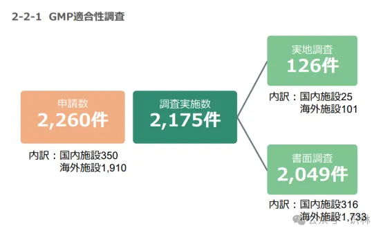 由上图可知,2024年,PMDA共收到2,260件需要GMP检查的申请,实际完成检查2,175件,大部分是通过书面完成的。在126件实地检查中,针对海外设施的检查远远超过国内设施。GCTP申请数量要少得多,且大多数申请并未实施检查。