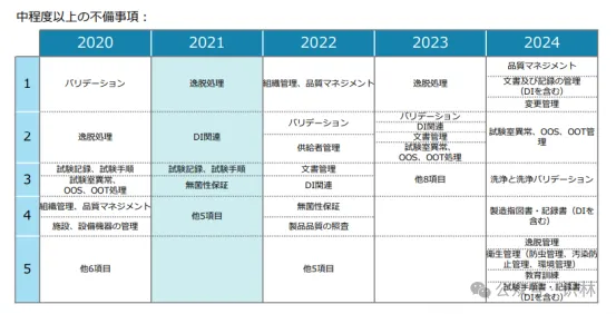 检查缺陷方面,中等程度以上的不合规项(包括中等和重大)在2024年有了比较明显的变化。主要集中在质量管理,文件及记录管理(包括数据可靠性DI),变更管理,实验室异常、OOS、OOT管理,清洁与清洁验证,生产指令与记录(包括DI),偏差管理,卫生管理(包括防虫管理、污染防止管理、环境管理),培训,以及检验规程与记录(包括DI)等方面。