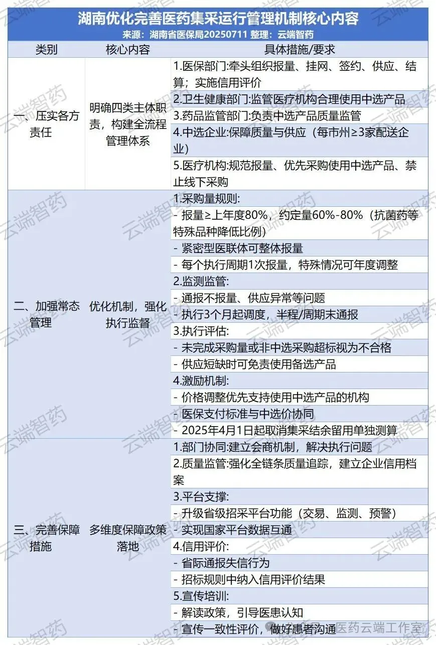 7月11日,湖南省医保局、省卫健委、省药监局、省公共资源交易中心发出《关于优化完善医药集中带量采购运行管理机制的通知》(湘医保发〔2025〕38号),完善医药集采的运行管理机制。