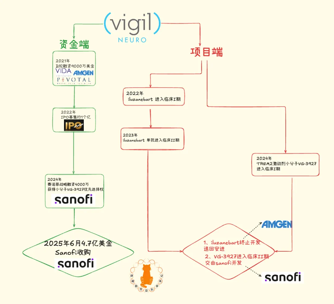 2025年5月,Sanofi宣布以总价4.7亿美元收购Vigil,外加每股2美元的CVR延期付款(VG-3927上市后再给)。但Sanofi只要了小分子VG-3927项目,VGL101单抗没要。交易预计2025年三季度完成。