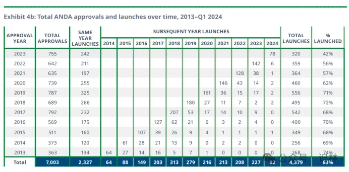 在分析获批ANDA的仿制药上市时间线时发现(见上图),尽管获得FDA批准,但许多仿制药在进入市场之前存在显著延迟。获批当年和次年集中上市之后,药企动力似乎耗尽,数量断崖式下跌,致使相当一部分药品在获批多年后仍未上市。平均而言,在获批两年后,仍有超过200种获批ANDA的仿制药未上市。