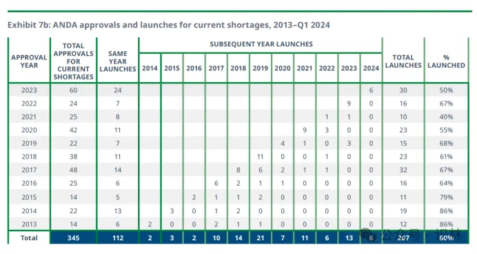 短缺不能归因于FDA不批。2013年至2024年第一季度期间,37%的获批仿制药尚未上市,且通常需要超过四年时间才有70%的仿制药能够进入市场。在当前短缺药品中,62%已有获批的仿制药,但其中84%至少有一个已获批但未上市的产品,21%的品种的已获批仿制药完全没有上市。注射剂受影响尤为严重,在短缺药品中,75%涉及未上市的仿制注射剂。