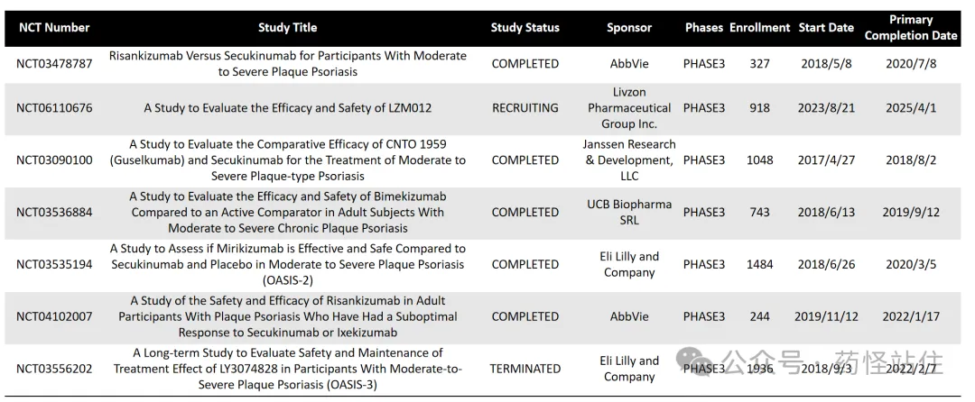 2024年9月3日,头对头Cosentyx的共7项III期临床研究,主要涉及二代IL-23 p19单抗以及IL-17A/17F单抗,艾伯维(IL-23 p19)、强生创新(IL-23 p19)、礼来(IL-23 p19)、UCB(IL-17A/F)皆有参与,值得一提的是,国内丽珠制药也前瞻性布局,头对头Cosentyx III期。