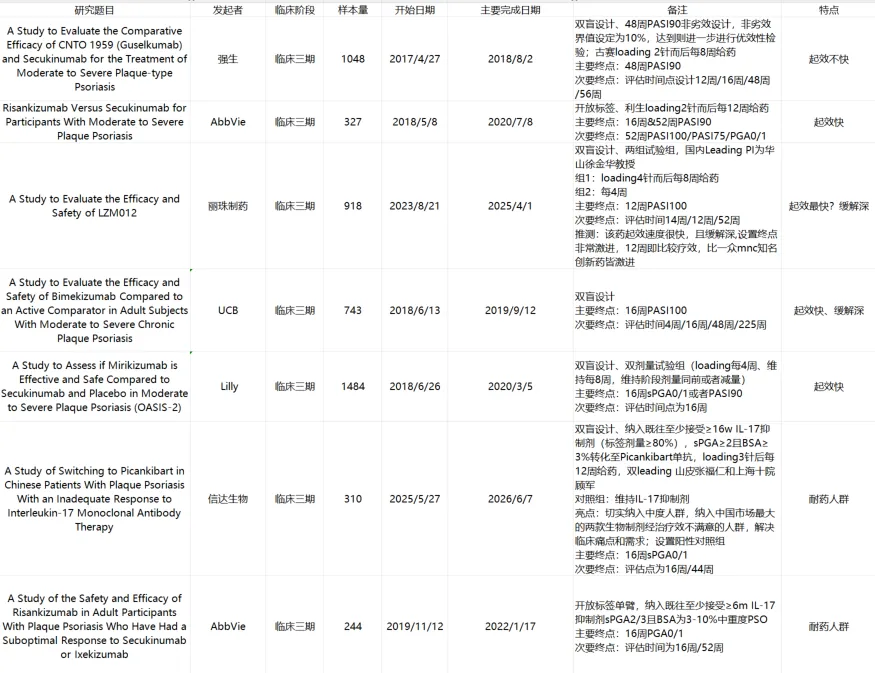 同时信达生物的NCT06945107,同样引人注意:双盲设计、纳入既往至少接受≥16w IL-17抑制剂(标签剂量≥80%),sPGA≥2且BSA≥3%转化至Picankibart单抗,loading3针后每12周给药,双leading 山皮张福仁和上海十院顾军教授,对照组:维持IL-17抑制剂。亮点:切实纳入中度人群,纳入中国市场最大的两款生物制剂经治疗效不满意的人群,解决临床痛点和需求;设置阳性对照组,主要终点:16周sPGA0/1,次要终点:评估点为16周/44周。对比之下,海外大卖的Risankizumab做的耐药研究是一项单臂研究,并未设置对照组。