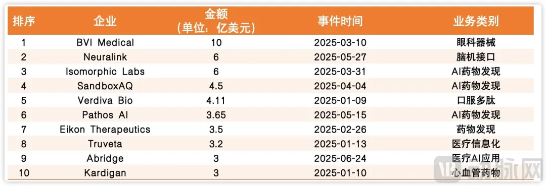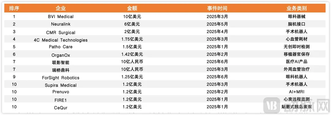 在国内,和往年被生物医药霸榜不同,2025H1国内融资TOP10榜单生物医药和器械耗材相对均衡。