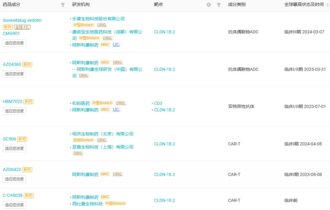 根据 Insight 数据库,在 CLDN18.2 赛道,阿斯利康布局了 6 款产品,其中有 5 款产品已进入到临床阶段,包括两款 CLDN18.2 ADC、两款 CLDN18.2 CAR-T、一款 CLDN18.2×CD3 双抗。