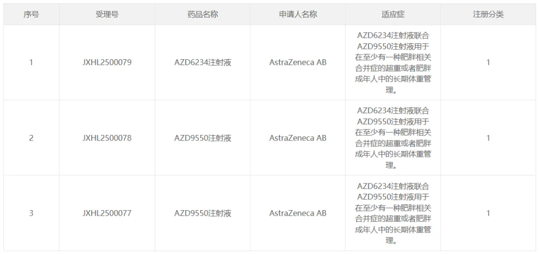 AZD9550 是一款在研 GLP1R/GCGR 双重受体激动剂,本次为其首次在国内获批临床。AZD6234 是一款长效胰淀素类似物,此前已在国内获批开展单药用于肥胖适应症的临床研究。