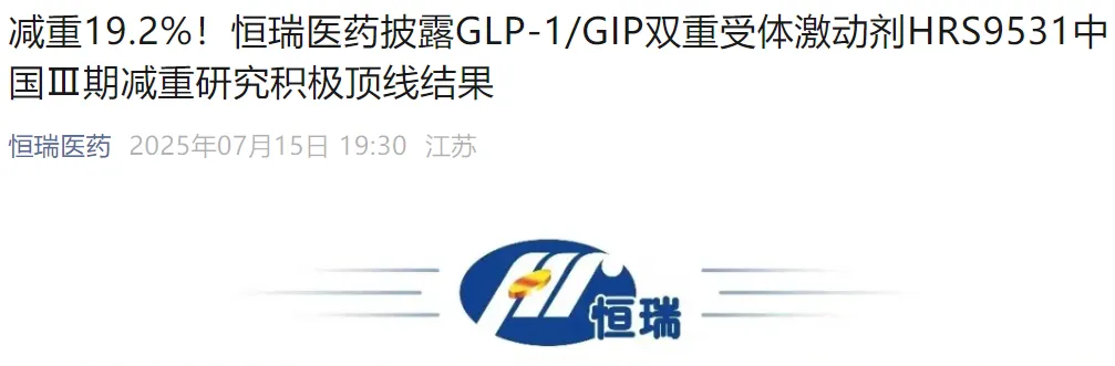2025年7月15日,恒瑞医药与美国Kailera Therapeutics公司共同宣布,GLP-1/GIP双重受体激动剂HRS9531注射液治疗中国肥胖或超重受试者的Ⅲ期临床试验(HRS9531-301)获得积极顶线结果。