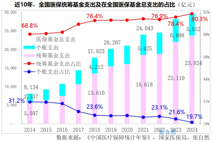 但是当前职工医保参保人群中,年轻健康群体占比较高,其个人账户资金因医疗需求较少而大量沉淀,使用效率低下。以《2024年医疗保障事业发展统计快报》为例,全国医保基金总支出29675.92亿元,其中,个人账户支出5851.1亿元,占了全国医保基金总支出的19.7%。据《中国医疗保障统计年鉴》,近10年个人账户支出占全国医保基金总支出从2014年的31.2%降低到2024年的19.7%。详见下图。
